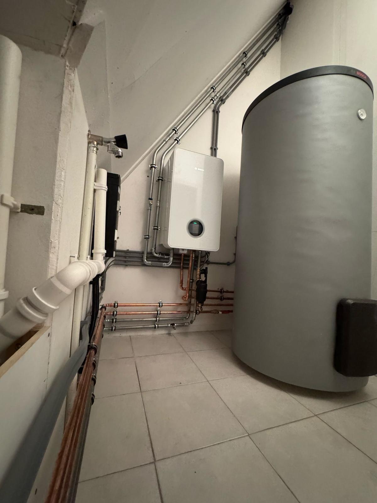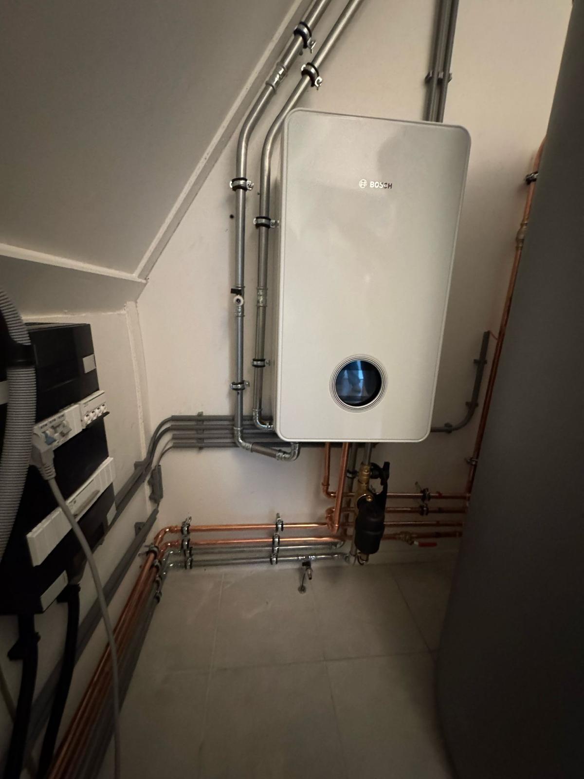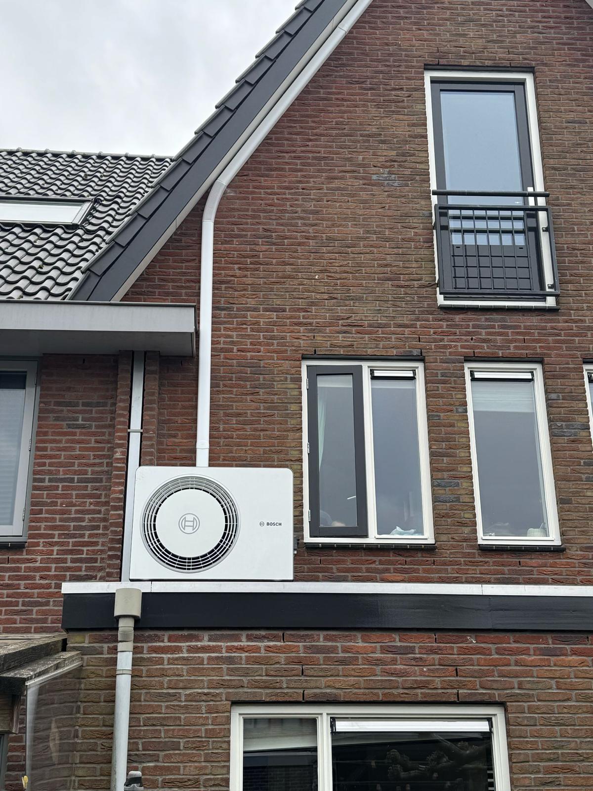 We hebben een lucht-water warmtepomp (all-electric) geïnstalleerd: Bosch Compress 5800i AW 7 kW monoblock, i.c.m. een 200 L tapwaterboiler en 100 L buffervat. De regeling stuurt weersafhankelijk aan; beneden draait het systeem op lage aanvoertemperaturen voor maximale efficiëntie, boven ondersteunen lage-temperatuur radiatoren het systeem.