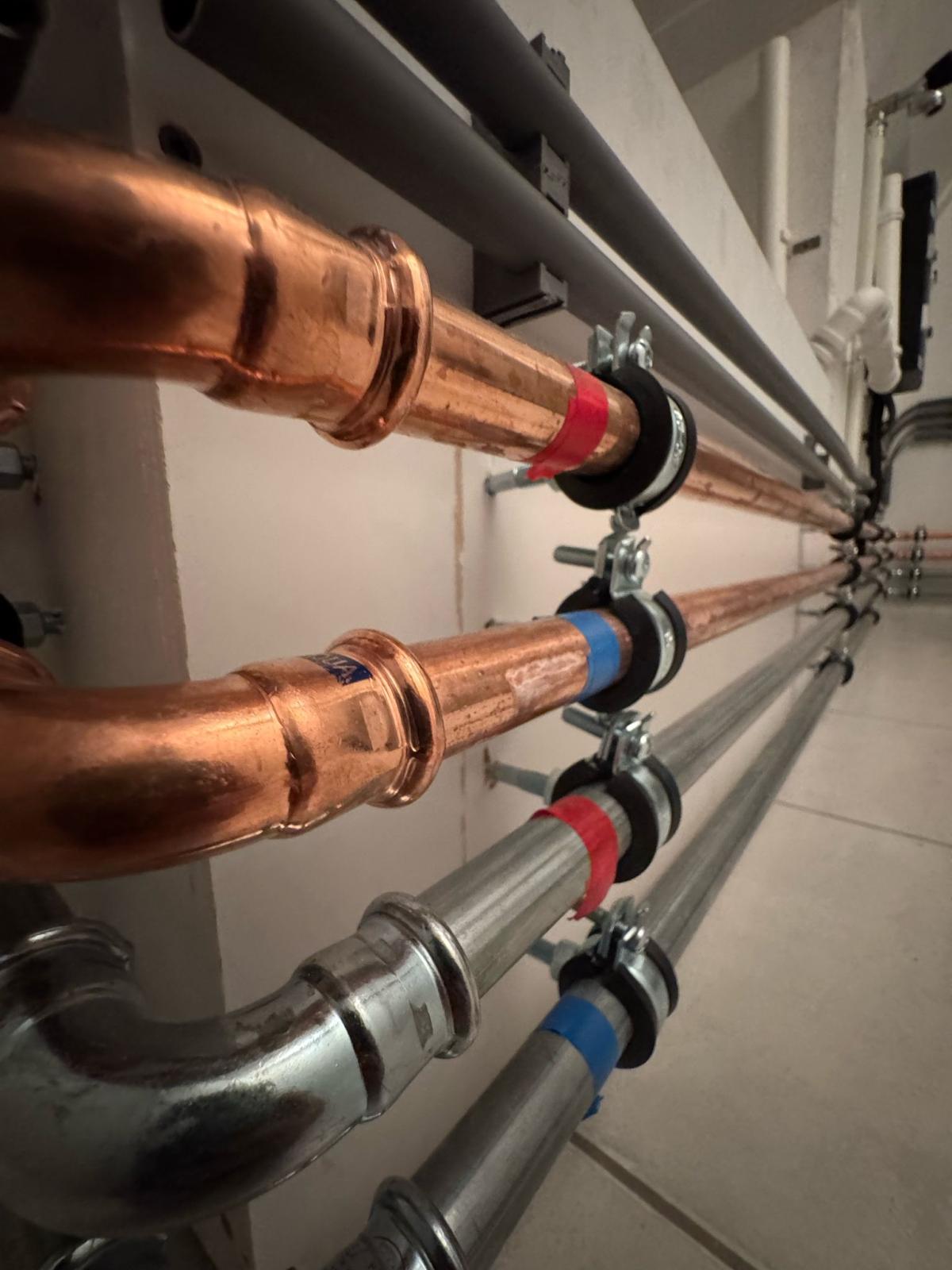 Binnenopstelling (boiler + buffervat + verdeler) compact in de bijkeuken, leidingen afgewerkt in kabelgoot.